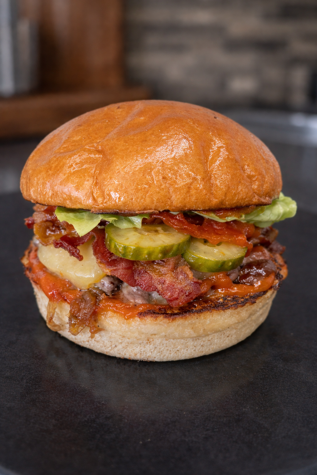 steak haché de boeuf, bacon**, cheddar, oignons rouges, salade, sauce piccalilli maison